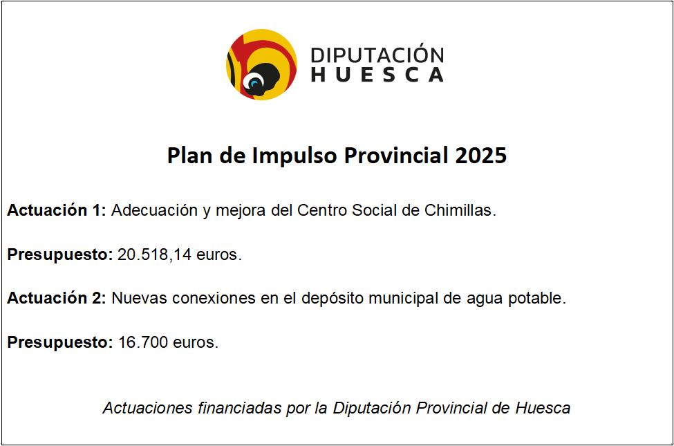 La Diputación Provincial de Huesca a través del Plan de Impulso Provincial 2025, ha otorgado al Ayuntamiento de Chimillas una subvención de 37.218,14 € destinada a la financiación de las siguientes actuaciones: